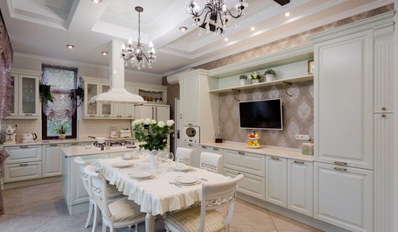 Для оборудования кухонного пространства, совмещенного с гостиной необходимо правильно выбрать гарнитур. Так, для комнат с высокими потолками, лепниной, мраморным полом удачным решением станут кухни классика. Подобные версии отличаются симметричностью, четкостью форм, естественными расцветками. Для декоративной отделки применяются разнообразные вставки, узоры, решетки, резьба, позолота и патина. Это отличный вариант для создания роскошного интерьера.