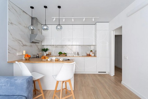 Если же помещение радует габаритами или планируется меблировка квартиры-студии, то дизайн кухни в белом цвете может включать в себя наличие барной стойки, острова или полуострова. Любое решение в светлой палитре будет выглядеть эффектно, вне зависимости от того, используются ли при создании современные материалы или благородный массив древесины.