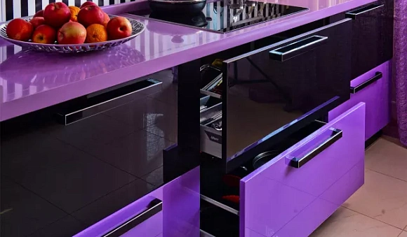 Эксперты настоятельно рекомендуют при принятии решения приобрести фиолетовый кухонный гарнитур учитывать местоположение окон – на какую сторону выходят. Во многом это связано с тем, что объем света оказывает прямое воздействие на визуальное восприятие помещения.