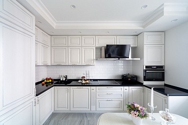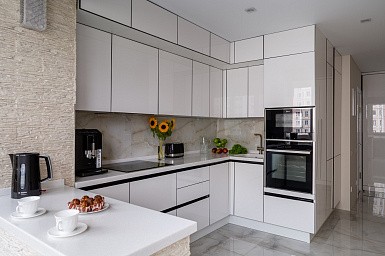 Чтобы П-образная кухня вписалась в интерьер максимально гармонично, расстояние между параллельными сторонами должно составлять, как минимум 120 см. В этом случае не возникнет сложностей при открывании духовки и дверец шкафов.