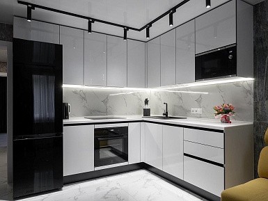 Угловая конфигурация – идеальное решение для небольших и средних комнат. При такой планировке шкафы размещают вдоль двух смежных стен. Особое внимание уделяют соблюдению рабочего треугольника, при котором плита, мойка и холодильник размещаются на одинаковом расстоянии друг от друга.