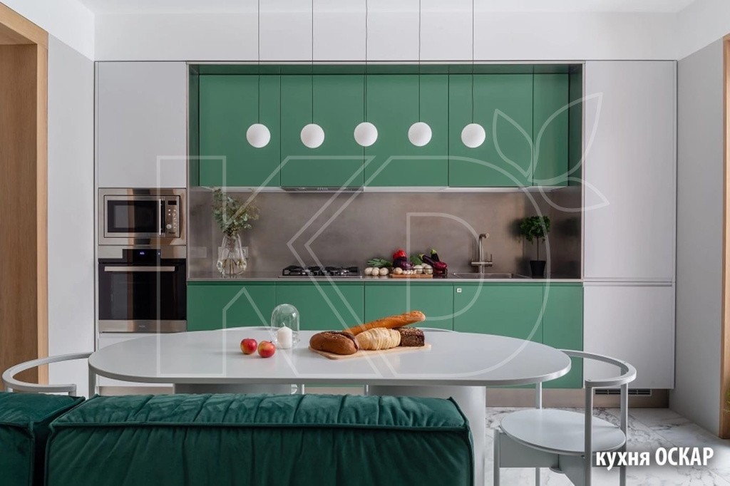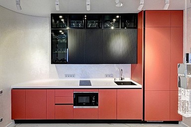Линейная планировка предполагает расположение всех модулей гарнитура вдоль одной стены. Благодаря этому сохраняется полезная площадь в самом небольшом пространстве.
