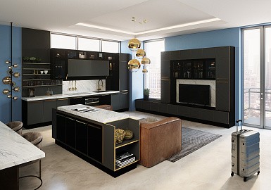Гарнитур с островом – подходящая модель для квартиры-студии или загородного дома. С помощью такого комплекта можно визуально отделить обеденную зону от гостиной, используя островную конструкцию в качестве стола для приема пищи или дополнительной рабочей поверхности.