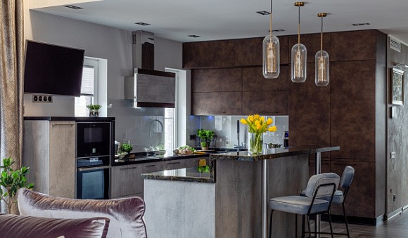 Модели с барными стойками интегрируют в просторные квартиры-студии. С помощью такого гарнитура можно визуально отделить обеденную зону от гостиной. При этом дополнительная конструкция может применяться в качестве рабочей поверхности или стола для приема пищи.