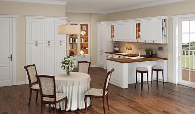 Иногда кухни на заказ от производителя делают из монолитного и прочного древесного массива. Профессионалы советуют остановить свой выбор на ясене, буке или дубе, но стоимость такой мебели высока. Сэкономить получится на сосновом массиве, но из-за мягкости этого материала с таким гарнитуром нужно бережно обращаться. Размокание, плесень и древесные вредители не испортят вашу кухню, так как фасады будут обработаны специальными средствами.