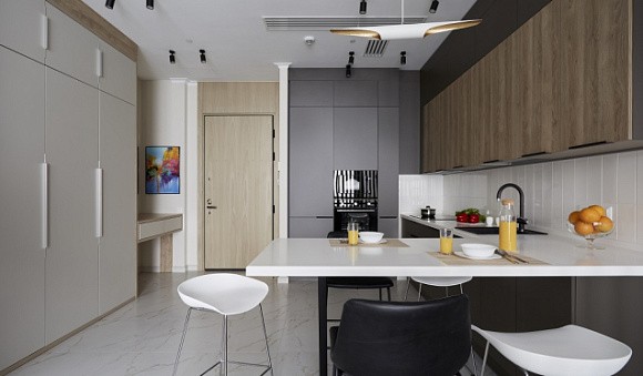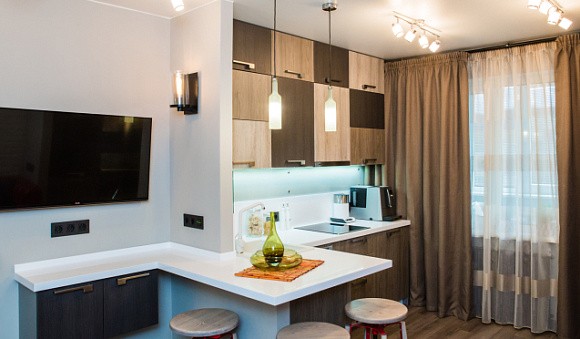 Кухни коричневого цвета привлекательно смотрятся как в однотонном, так и в комбинированном виде. Например, для небольшого помещения основной тон можно разбавить бежевыми, молочными или песочными вставками. При этом более светлый оттенок следует использовать для фасадов верхних шкафов.