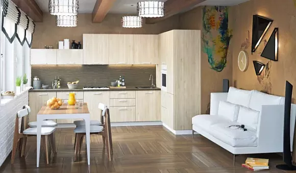 Для комнаты на северной стороне используйте более яркие акценты и вставки. Так, поверхности кухни коричневых цветов можно разбавить желтыми, алыми или оранжевыми оттенками. Такая комбинация внесет в пространство немного тепла и будет смотреться позитивно и интересно.