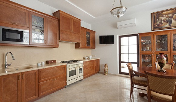 Классический гарнитур отличается симметричными линиями и выверенными формами, а также роскошным декором. Фасады таких комплектов оформляют прозрачным или витражным стеклом в деревянных рамках, позолотой, лепниной, патиной. Для отделки фартука в классическом интерьере используют матовый или глянцевый кафель с орнаментом шоколадного или коньячного оттенка, мозаику золотого цвета.