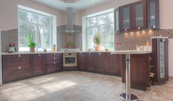 Если коричневый кухонный гарнитур предназначен для просторного помещения, используйте для оформления стен обои с ненавязчивым рисунком. Для интерьера в современном стиле подойдет кирпичная кладка и декоративная штукатурка. Полы могут быть как светлыми, так и темными. Для классического дизайна желательно, чтобы они были изготовлены из мрамора, натуральной древесины или качественного ламината с фактурой дерева.