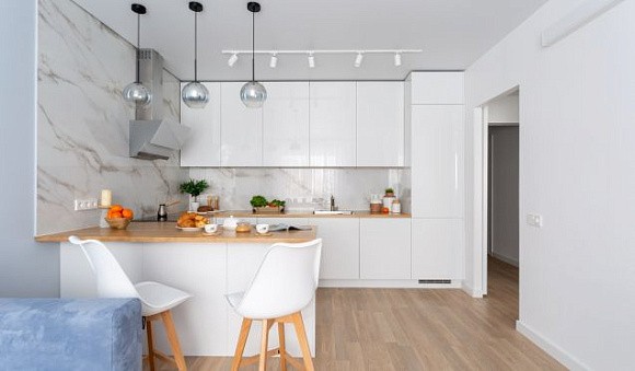Кухонная мебель с барной стойкой или островом подойдет для квартиры-студии. Благодаря дополнительному элементу можно визуально разделить пространство на отдельные зоны – обеденную и гостиную.