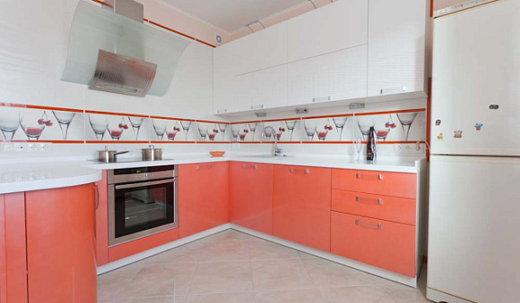 Необходимо подобрать привлекательные цвета для самой кухни и использовать такие оттенки, чтобы кухня удачно сочеталась и с другими комнатами в доме. Например, если вы решили оформить кухню в оливковых тонах с переливами оранжевых тонов, стоит присмотреться к использованию в интерьере коричневых цветов, персиковых или песочных оттенков, которые создадут контраст. Такие цвета идеально подходят для оформления фартука, помогают немного разгрузить интерьер, а также создают грамотное цветовое зонирование пространства.