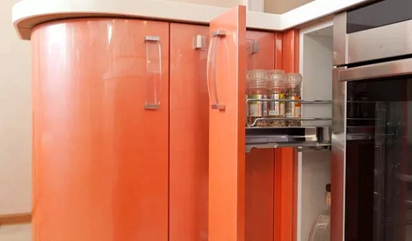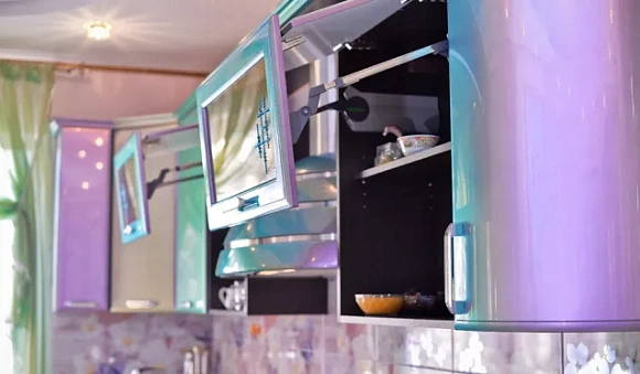 Чаще всего фасады кухонь, выполненных в стиле «хамелеон», изготавливают из МДФ. Их покрывают специальными лаками, обладающими уникальными свойствами. Благодаря этому создаются красивые переливы. Насыщенность и цвет фасада зависит от количества света в помещении, а также от направления лучей.