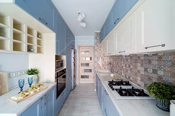 В кухне в стиле неоклассика должны преобладать спокойные оттенки, максимально приближенные к природным. В качестве основного подойдут пудровый, молочный, персиковый, светло-зеленый, нежно-розовый, небесный, серый и золотистый.