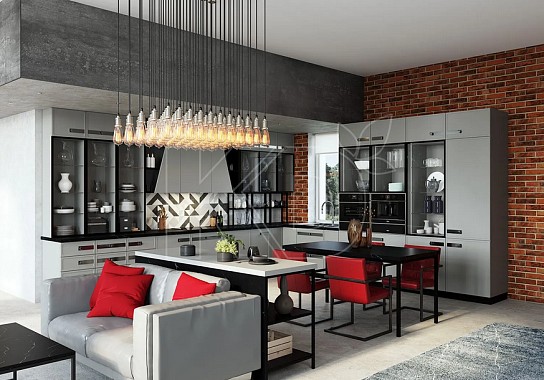 Поклонники модных трендов также по достоинству оценят не теряющие актуальности гарнитуры модерн, минимализм и хай-тек. Тем, кто хочет создать на кухне по-настоящему запоминающийся и уникальный интерьер, понравятся модели в стиле лофт. Фасады такой мебели стилизуют под мрамор, бетон, штукатурку, располагая их на фоне стены с имитацией кирпичной кладки или украшенной винтажными плакатами.