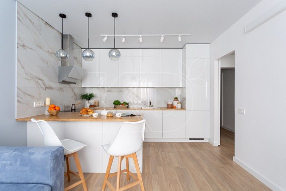При использовании белого в качестве основного цвета визуально кухня любой площади будет казаться более просторной. Эффект можно усилить при применении глянцевых фасадов мебели. Гладкие поверхности не только выглядят эффектно, но и отличаются практичностью. Глянцевые фасады практичны, проще очищать от неизбежных на кухне загрязнений, чем фактурные и бугристые.