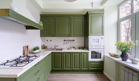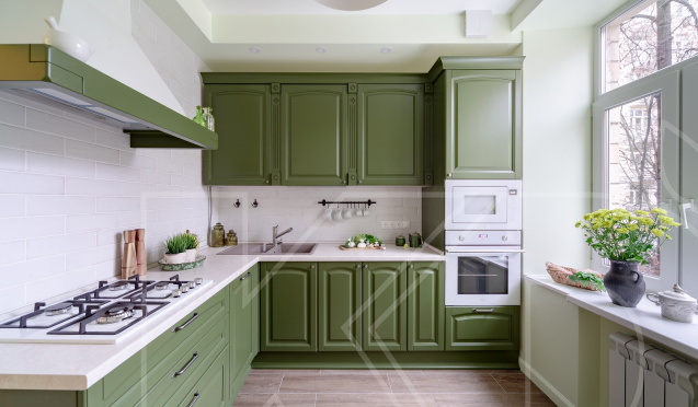Освещение зеленых кухонь – важный момент. Природные оттенки в интерьере не нуждаются в большом количестве осветительных приборов. Достаточно верхнего света и настольной лампы в зоне отдыха.