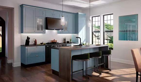 Прибрежный дизайн интерьера кухонного гарнитура также включает в себя светлые оттенки для создания расслабляющей атмосферы. Для этого стиля характерна воздушная цветовая палитра с холодными нейтральными оттенками, такими как голубой, белый и кремовый. В прибрежном дизайне также используется много натуральных материалов.