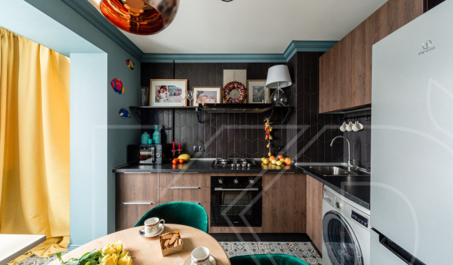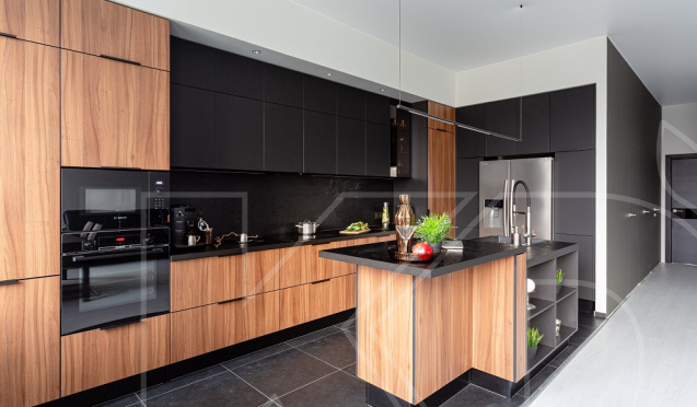 Темный кухонный гарнитур помогает добиться визуального дисбаланса в помещении. В случае, если планировка комнаты нестандартная, например, слишком широкая, применение кухонного гарнитура темного цвета станет отличным решением для такого помещения.