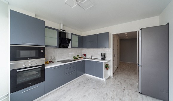 Кухонная мебель синих оттенков, дополненный серыми акцентами, притягивает внимание, а пол можно выполнить в любом приглушенном цвете. Если кухня маленькая, то ее стоит разбавить белым цветом.