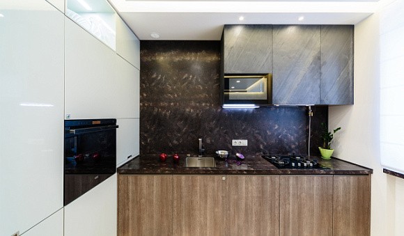 Прямая кухня компактно вмещается в пространство, создавая симметрию. Цена прямых кухонь в темных цветах ниже. Прямой кухонный гарнитур темного цвета выглядит умеренно в однотонном варианте: он не заостряет на себе внимание и не делает пространство меньше.