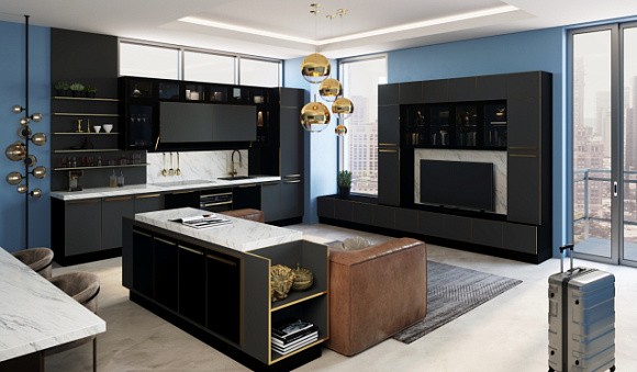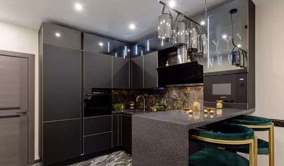 На угловых кухнях больше места, но и стоят они дороже. Есть один нюанс. Угловые кухни темного цвета лучше не использовать в вытянутых пространствах. Подобное решение окажется неудачным: находиться на кухне нескольким членам семьи будет неудобно.