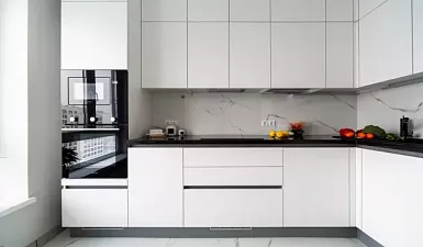 На первом этапе необходимо выбрать цвет стен, потолка и пола. Понять, какими будут фасады гарнитура – глянцевыми или матовыми, плоскими или филенчатыми.