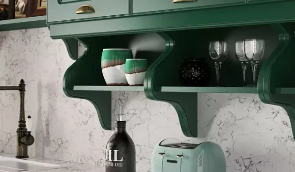 Подобрать зеленый комплект можно для любого помещения. Главное – учитывать, в каком стиле выполнена мебель для кухни. Если вы выбираете вариант для пространства с высокими потолками и большими окнами, обратите внимание на классические гарнитуры.