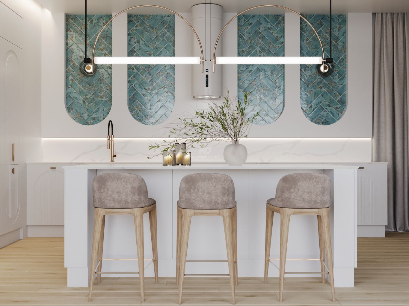 Ведущая доминанта кухни — рабочая зона с исключительно нижними модулями. Арочная фрезеровка на фасадах, направленная и вверх и вниз, придает пространству динамику. Мраморный рисунок на столешнице и фартуке отсылает к древнегреческим храмам, над ним — уложенная елочкой бирюзовая плитка. Элемент фартука? Больше. Это полноценный арт-объект.