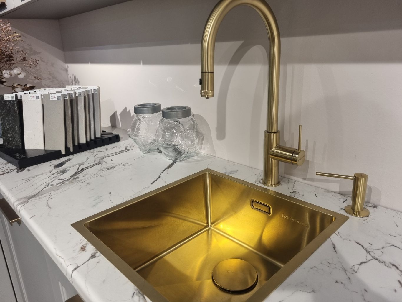 Фурнитура - Blum, включая подъемники и серводрайв. В стоимость образца входит: мебель, мойка, смеситель