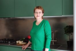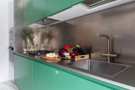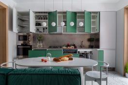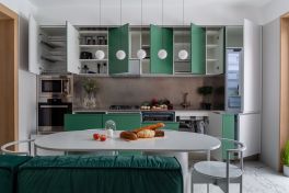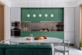 Сначала о кухне! Выверенная форма здесь задаёт тон, а цвета и материалы создают настроение. В кухне использована стильная комбинация серого и тёмно-зелёного цветов. Первый – отсылка к северному спокойствию, второй – к южной теплоте. Это редкое цветовое сочетание смотрится удивительно свежо! Гарнитур оснащён полным комплектом встраиваемой техники «Haier», а также огромным количеством аксессуаров и систем хранения. Здесь есть: большие ящики с разделителями внутреннего пространства «Orga-Line», система для хранения крупной посуды, комплекс выкатных сеток, ящик для хранения столовых приборов с системой «ручка+поводок», выдвижная корзина для хозяйственных принадлежностей, мусорное ведро с функцией автоматического открывания и многое-многое другое.