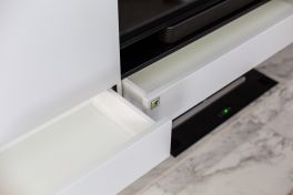 Теперь о гостиной! Она создавалась на основе модели «Фаворит» и имеет фасады, каждый из которых открывается лёгким нажатием при помощи системы «Tip-On». Деление фасадов по горизонтали соответствует расположению панелей на стенах, а ниша под ТВ-зону оформлена чёрным цветом, что делает телевизор практически незаметным. Стильный мини-камин довершает образ интерьеров, в которых красота юга и севера пребывают в идеальной гармонии!